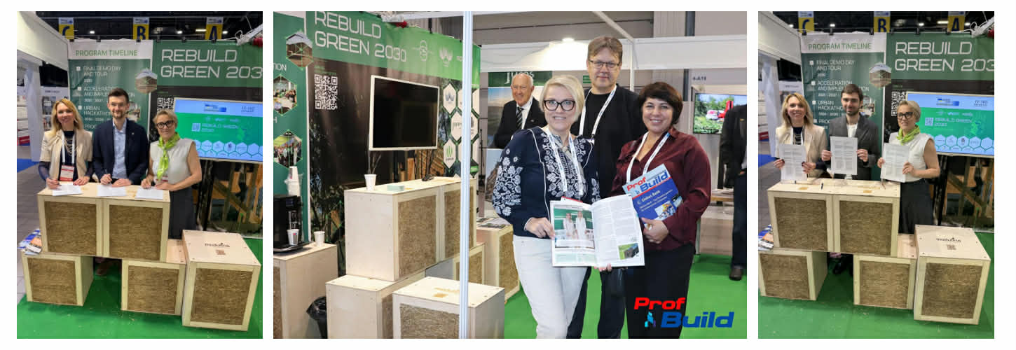 The exhibition marked a full year since the Rebuild Green Hackathon 2024. The winning budmo.team showed impressive progress on their project Ptahahata in Severynivka (Vinnytsia region). Using Modulina’s straw panels, they have already built the floor, walls, and roof of the structure.