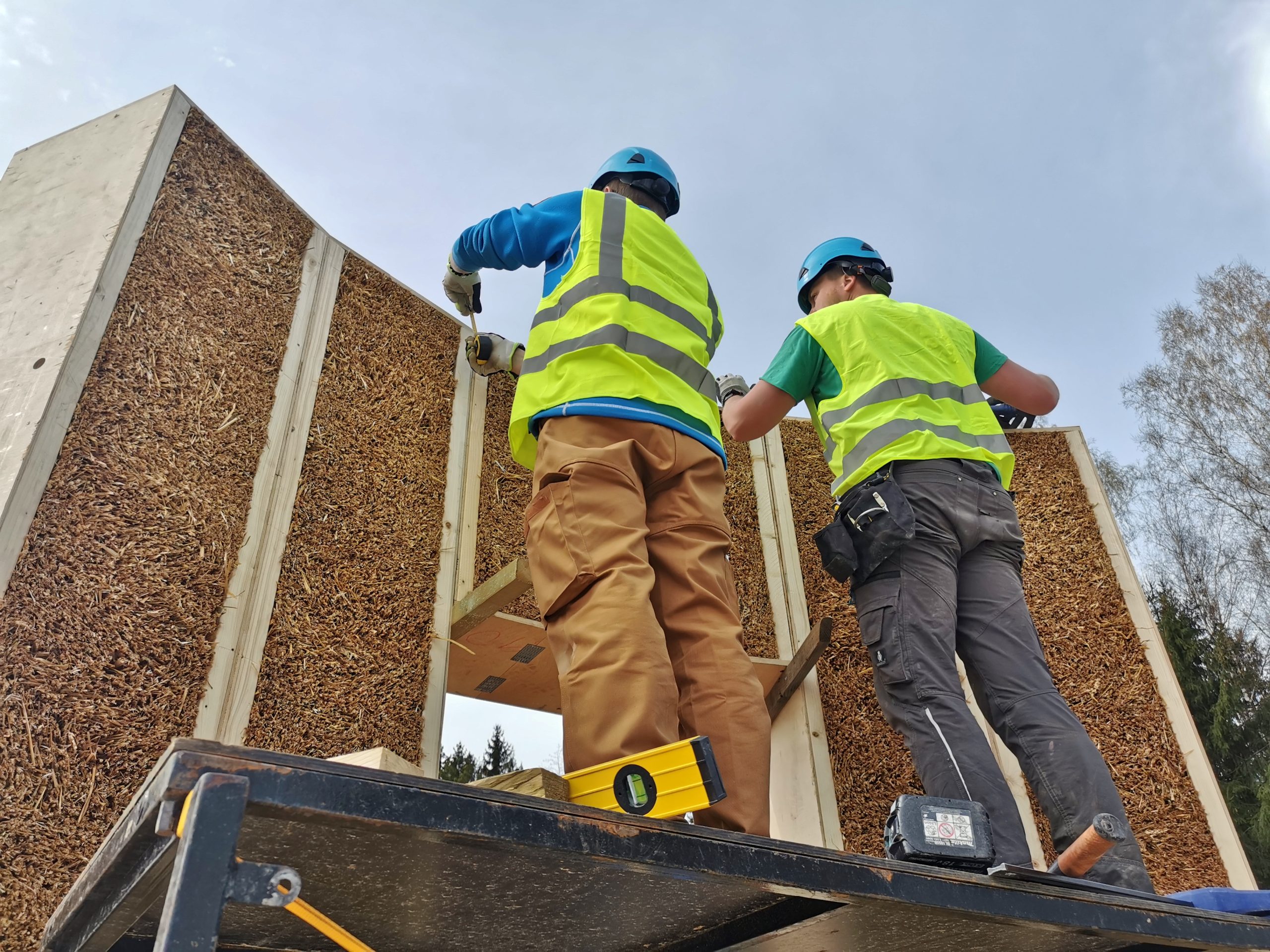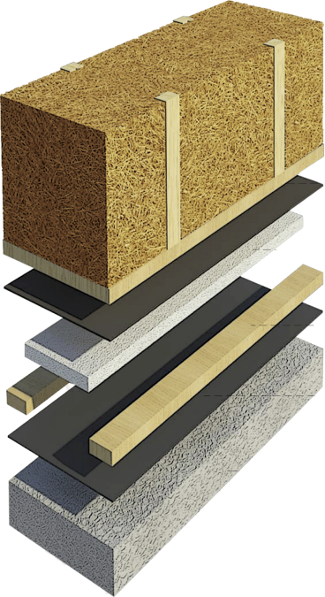 Une couche de base distincte est formée entre la fondation et un panneau de paille afin de transférer les charges à la fondation. Celle-ci se compose de deux liteaux en bois horizontaux avec une isolation XPS entre eux. Un panneau mince en fibres de bois est fixé sur le dessus. Cette base est solidement fixée à la fondation à l’aide de boulons, et le panneau de paille est fixé aux liteaux par des vis.